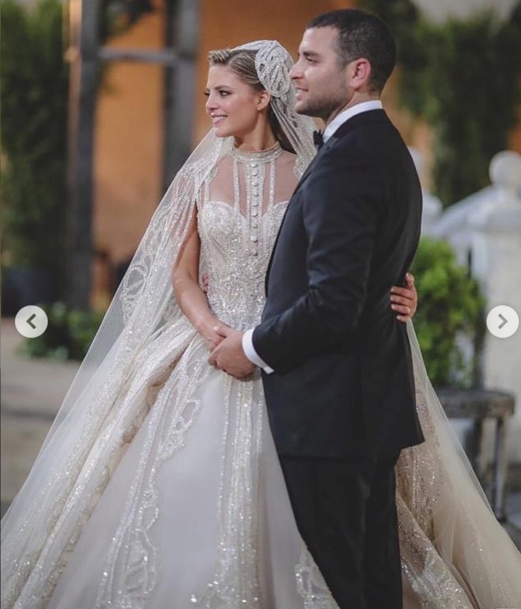 تألقت العروس زين قطامي بفستان زفاف فاخر من تصميم إيلي صعب. جاء مطرزًا بالكامل ومزودًا بكاب ملكي أضفى عليها طابع الفخامة والرقي. ظهرت بأكثر من فستان خلال أيام الاحتفال، جميعها من توقيع المصمم إيلي صعب خصيصًا لها.